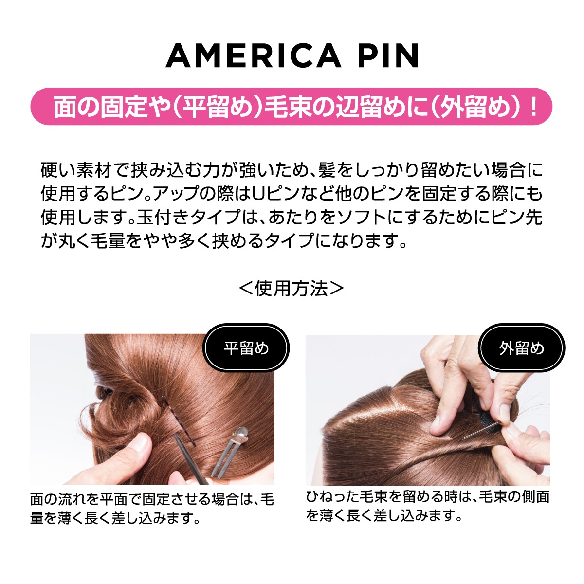 堅い素材で挟み込む力が強いため、髪をしっかり留めたい場合に使用するピン。アップの際はUピンなど他のピンを固定する際にも使用します。