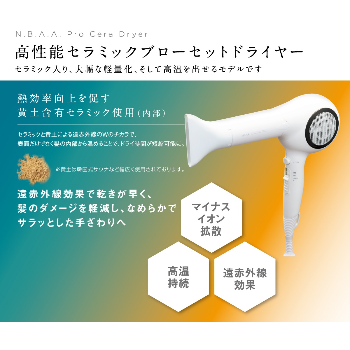 黄土含有セラミックを使用することにより、遠赤外線効果、マイナスイオン拡散などの効果が得られ、艶のある髪へと導きます。