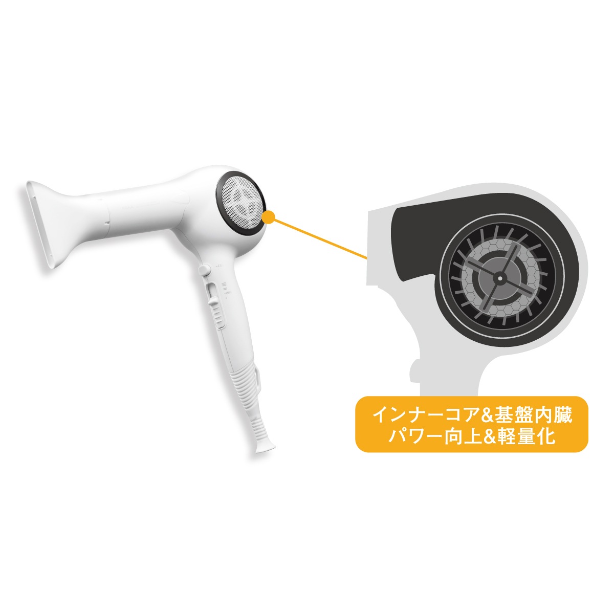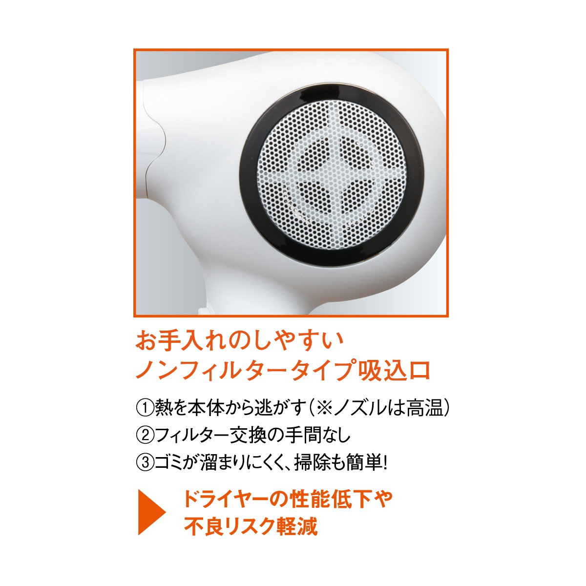 フィルターのない吸込口にすることで、ドライヤーの性能低下や不良リスクを軽減しています。